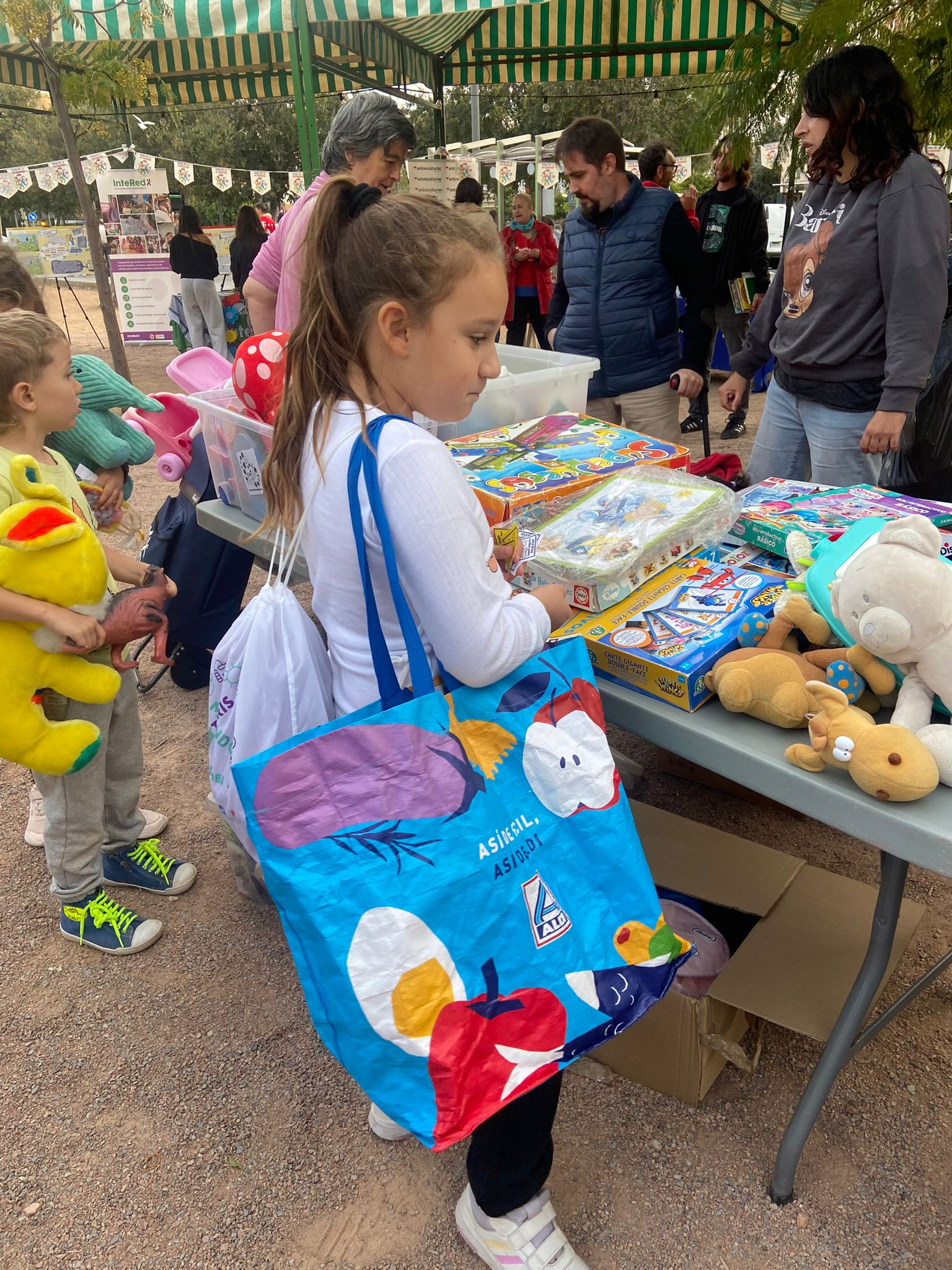 Después de ver el vídeo, hemos disfrutado de la información y las propuestas de los distintos puestos de las organizaciones presentes. Entre ellos, destacamos el puesto de trueque de libros y juguetes, para el cual nuestros chicos y chicas han llevado de casa objetos que ya no utilizaban. Mediante un sistema de tickets, han podido intercambiarlos por otros juguetes y libros que otras familias habían donado, dándoles así una nueva vida.